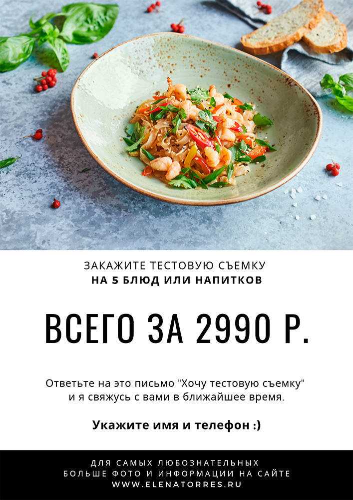 Если у вас есть вопросы или вы уже хотите опробовать тестовую съемку 5 блюд или напитков, то оставьте свои Контакты в форме обратной связи. Свяжусь с вами!