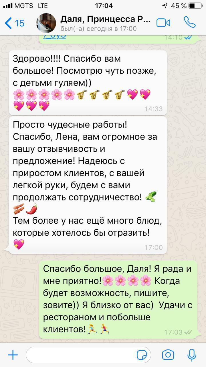 Понравилось двустороннее взаимодействие фуд-фотографа и заказчика, Елена прислушивается к нашим пожеланиям, стремится к лучшему. У нас появились "фирменные" аппетитные фото в правильном ракурсе.