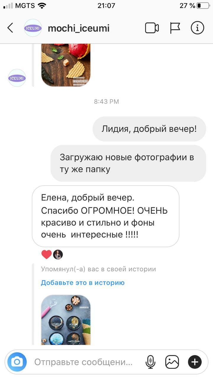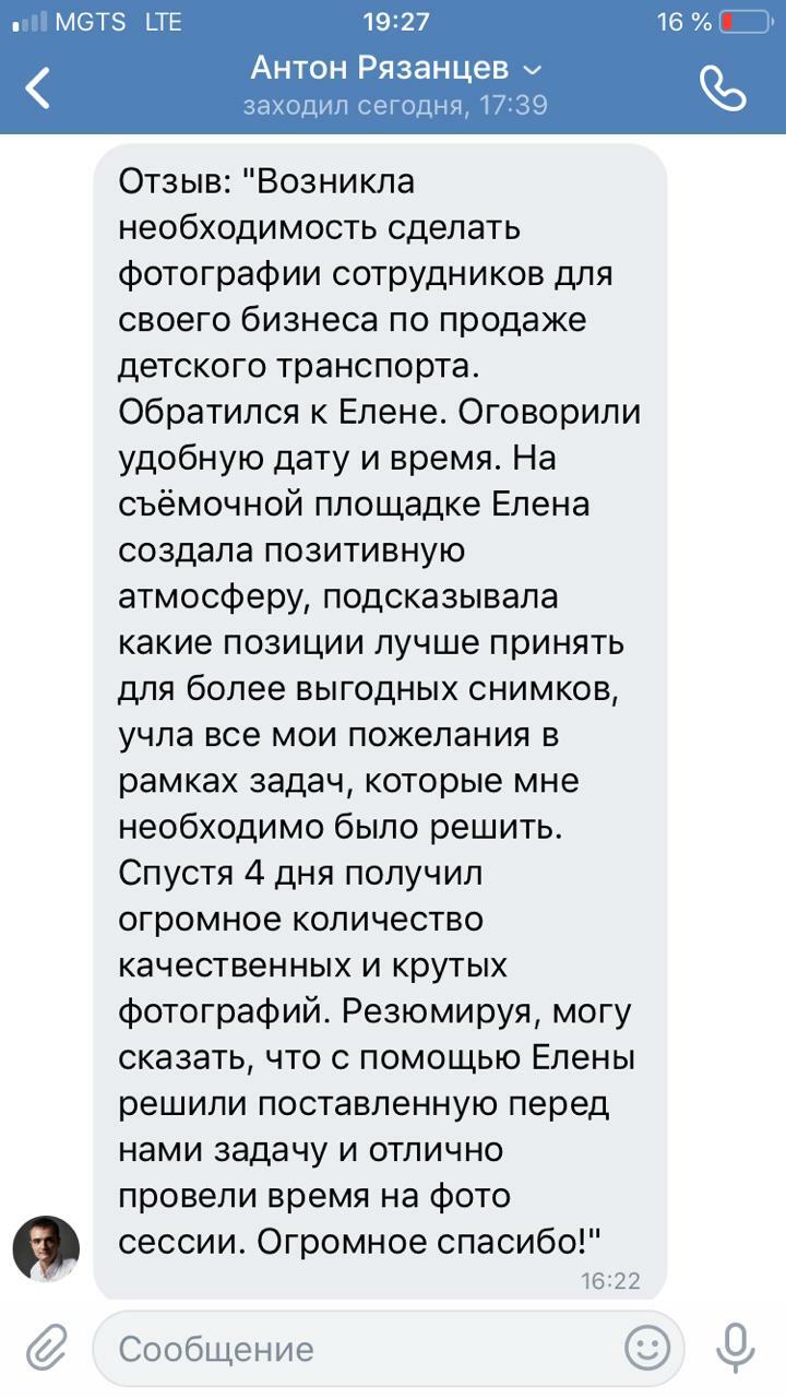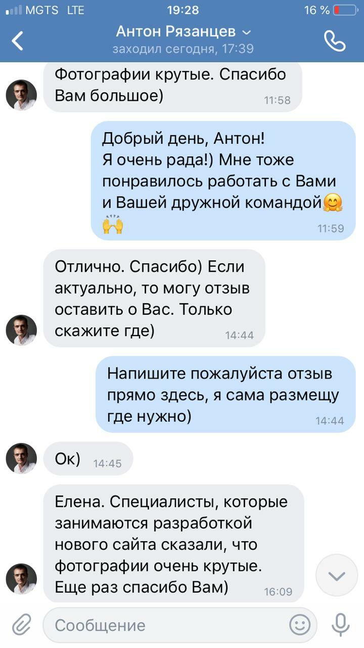 Понравилась открытость Елены, первичная мини-консультация, заинтересованность узнать мое мнение и как я вижу свой продукт на фото, быстрый результат! Фото были у меня уже через два дня. Я была очень довольна.